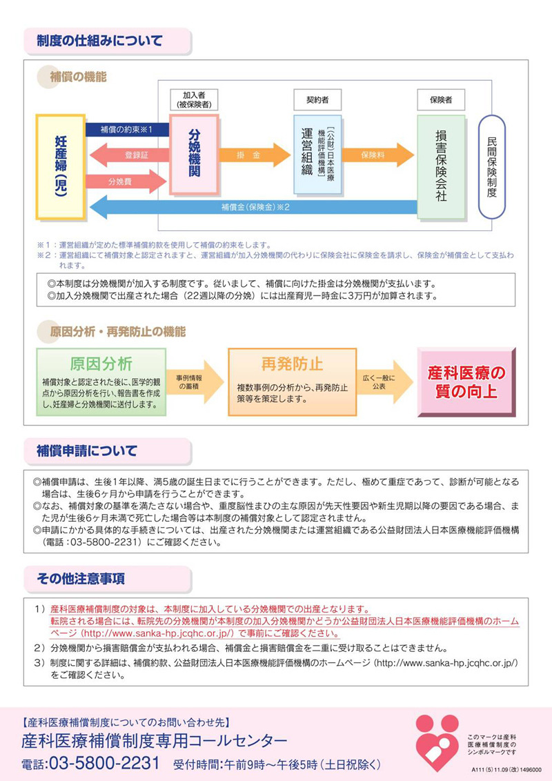 - 妊産婦の皆様が安心して産科医療を受けられるように、病院、診療所や助産所といった分娩を取り扱う機関が加入する制度です。
